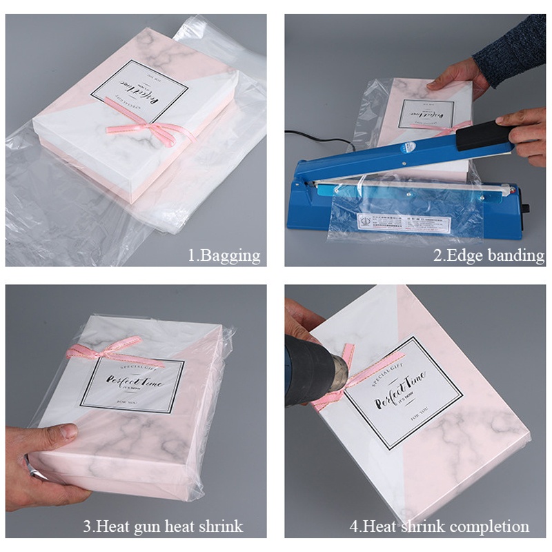 Sovellus: Shrink Film Roll sopii vaatteiden, vuodevaatteiden, lämpökutistuvien palapelien, paperitavaroiden, kirjojen, kuvakehysten, saippuanvalmistustarvikkeiden, kylpypommien, öljypullojen, CD-DVD-koteloiden, lahjojen, kynttilöiden, kosmetiikka, kenkien, viinipullojen, pienten lahjakorien, tee-se-itse-käsityön pakkaamiseen.